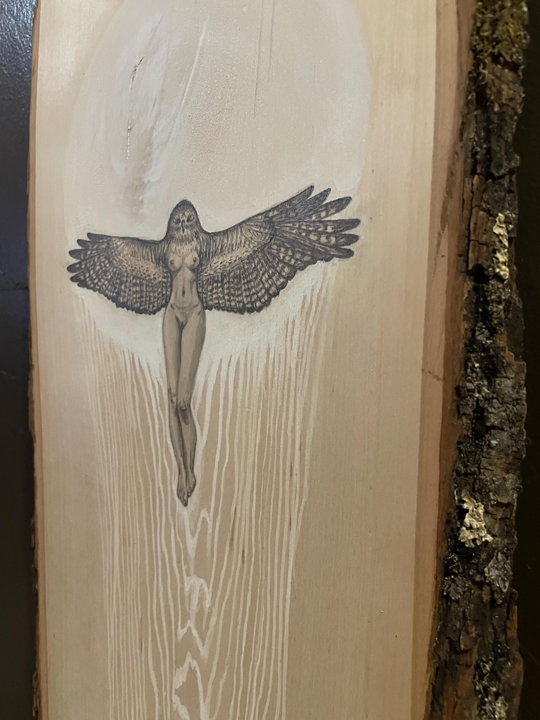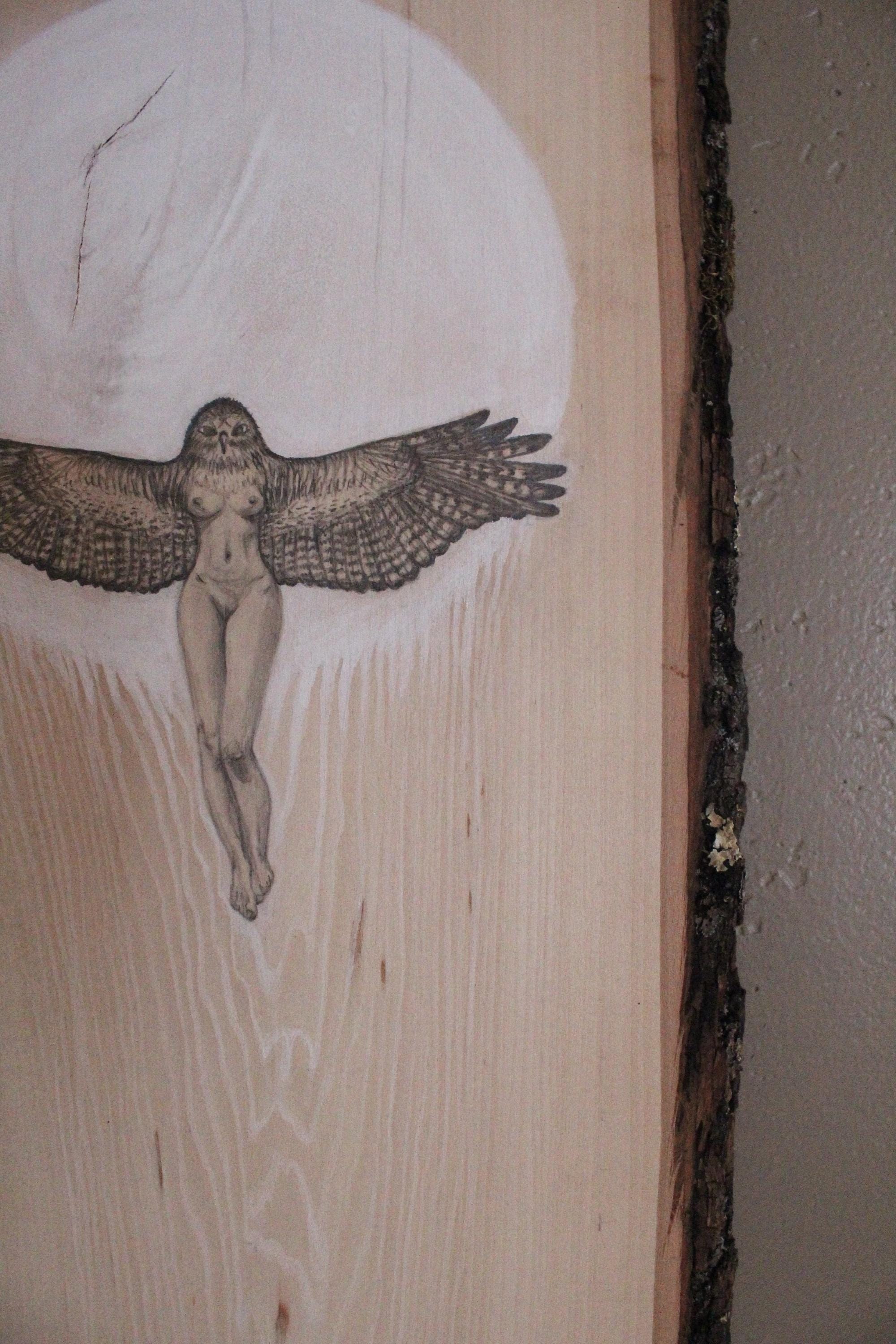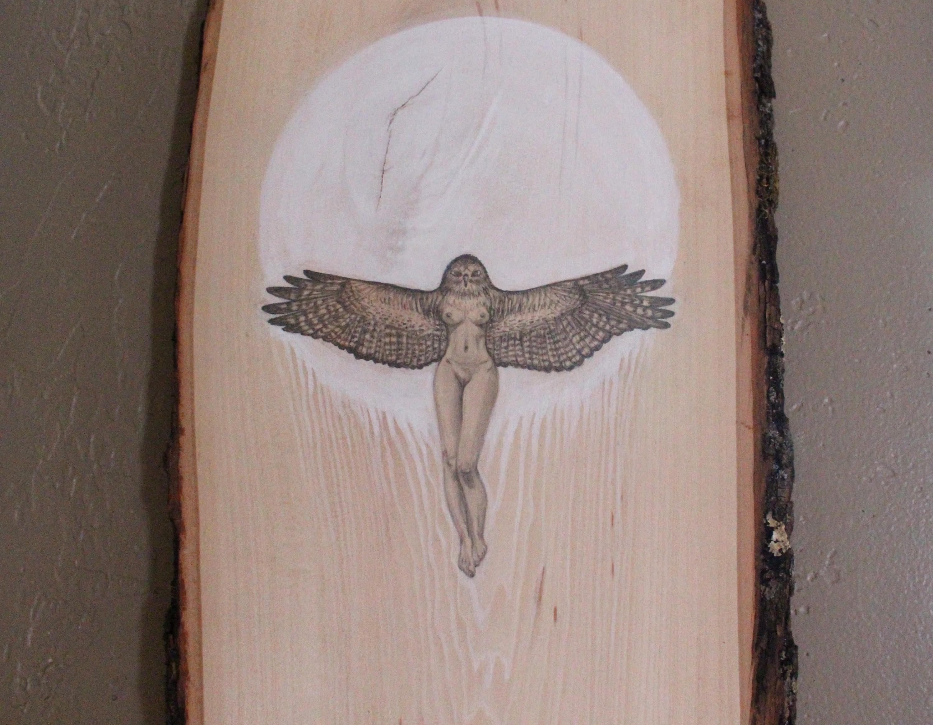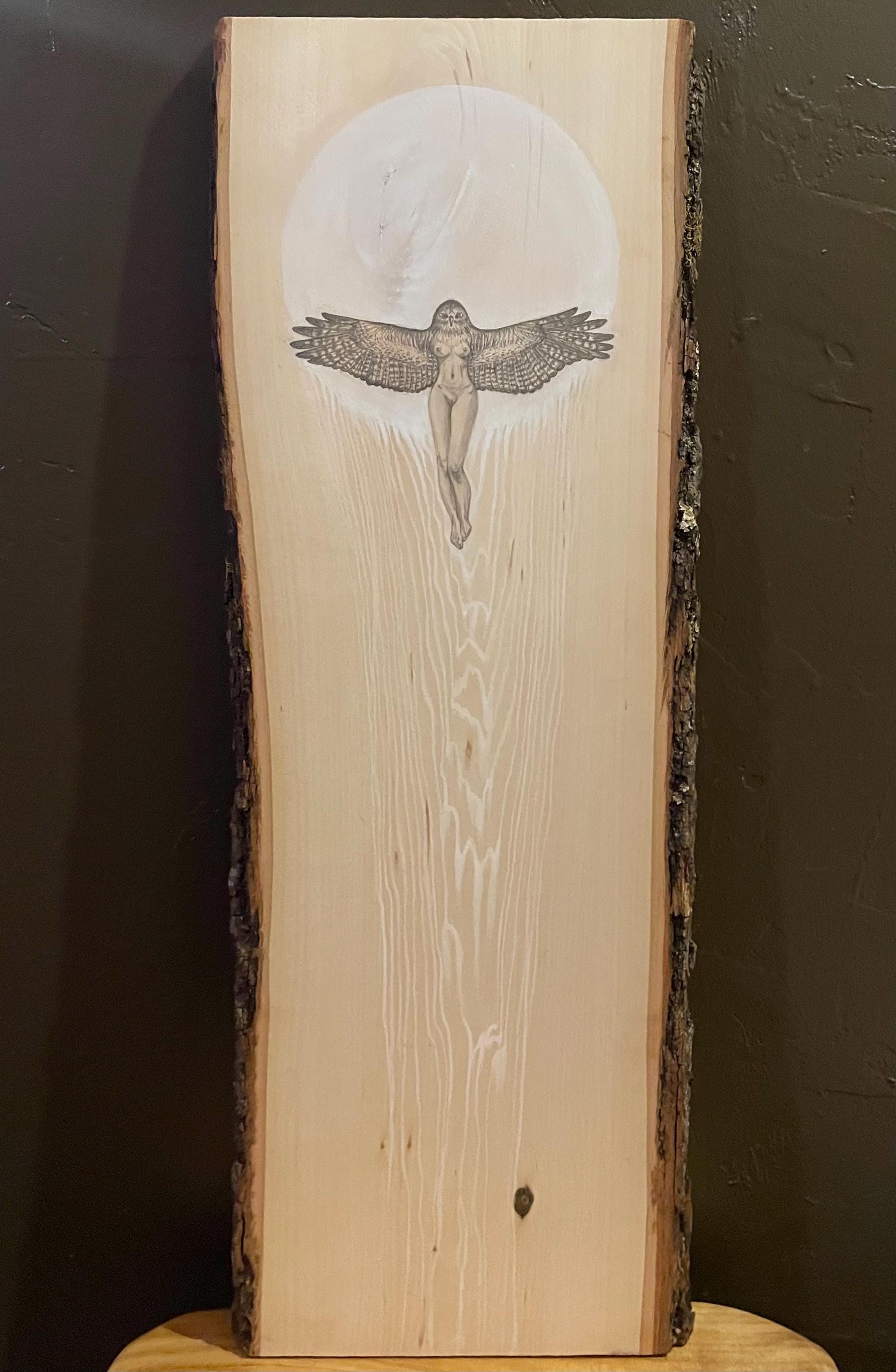 Original pencil and acrylic paint illustration on live edge, moss covered wood.
