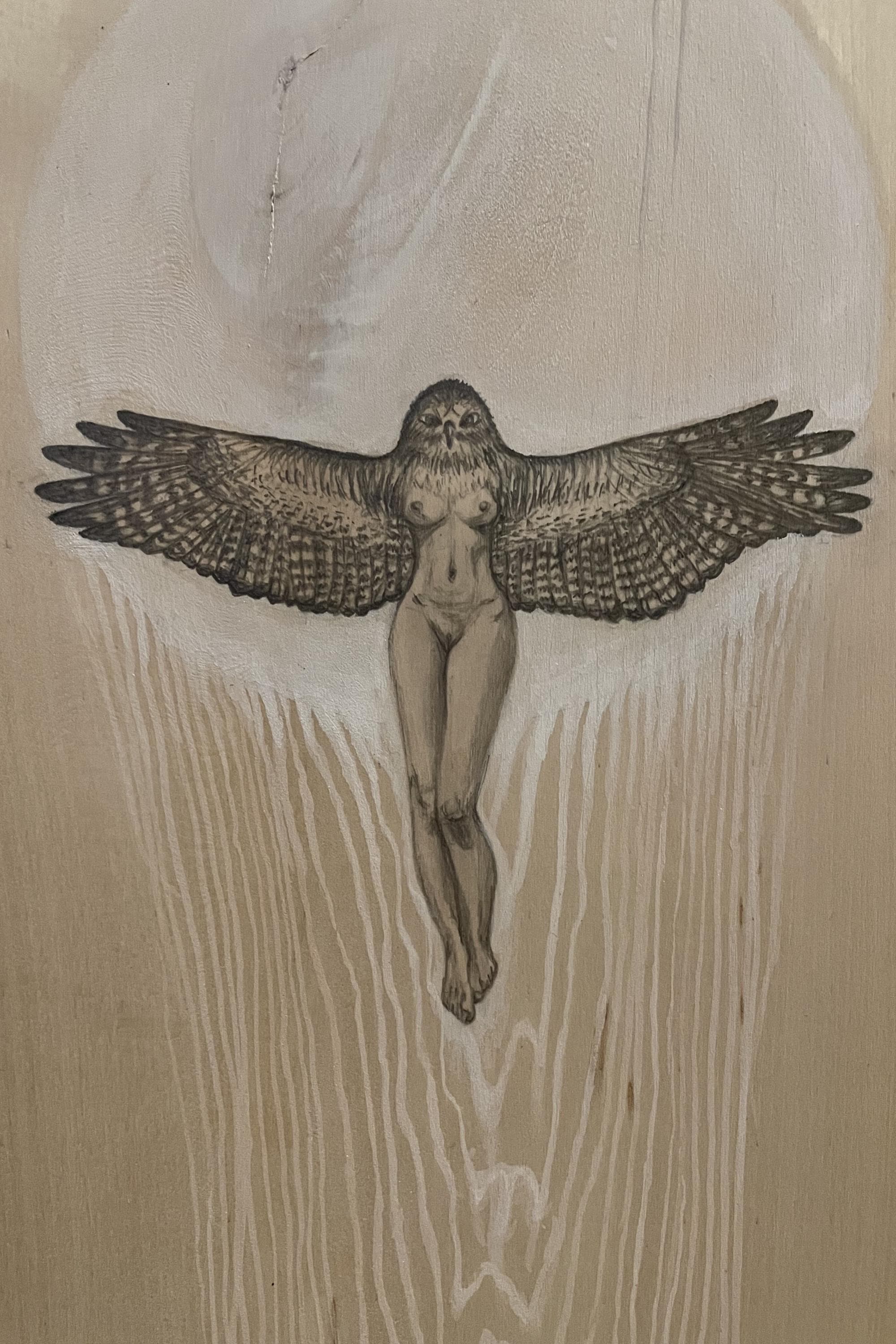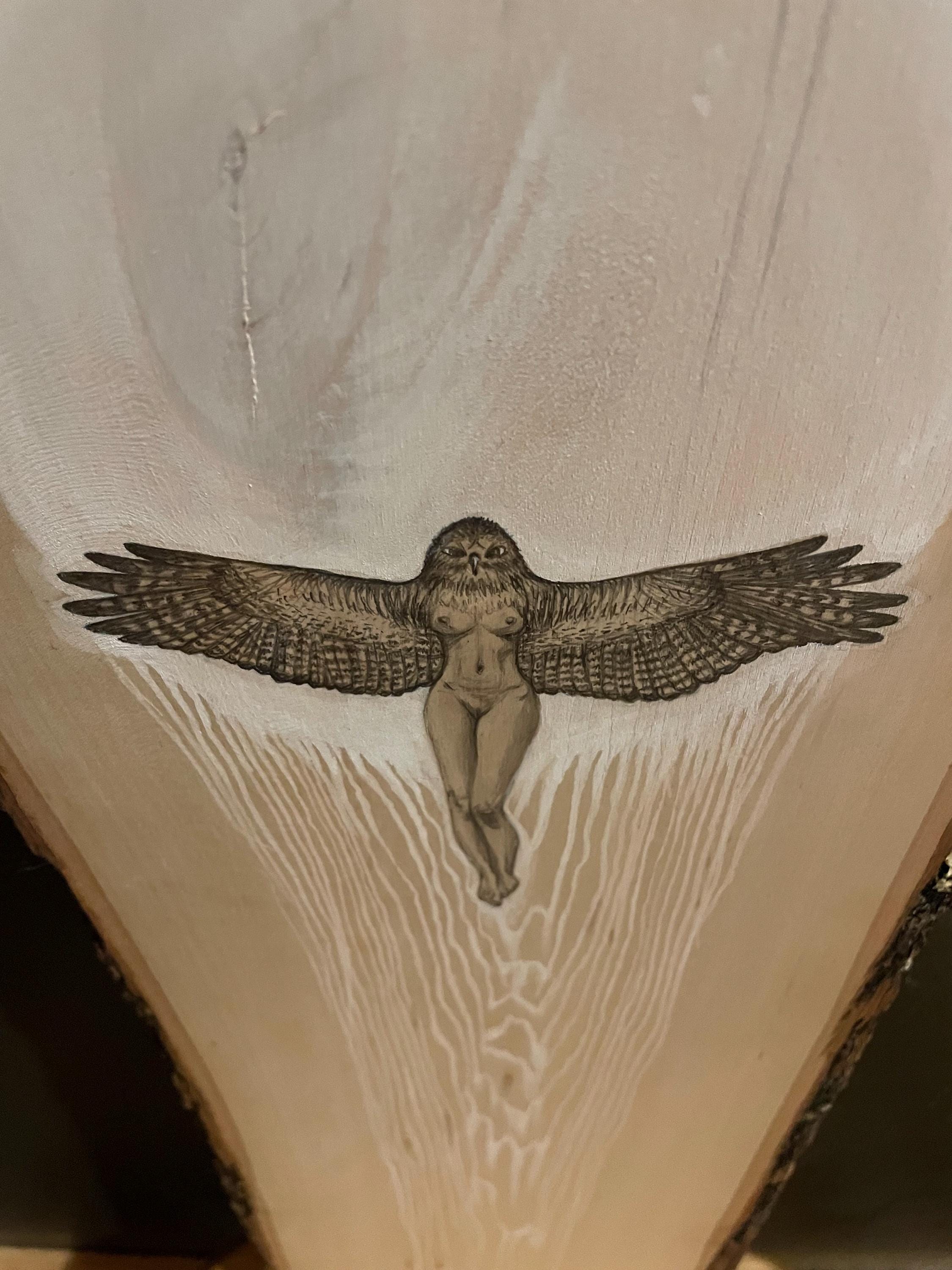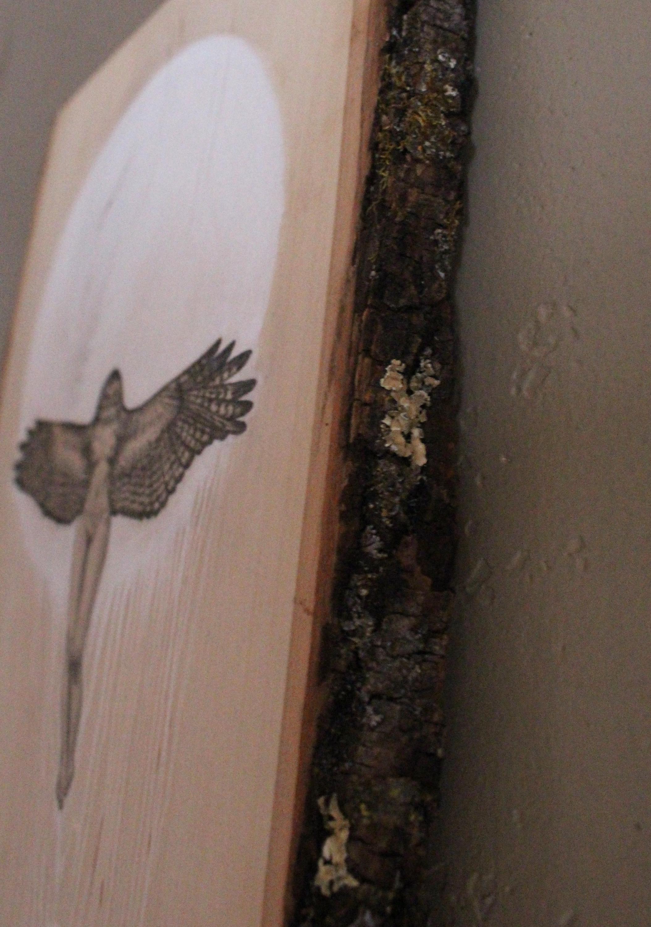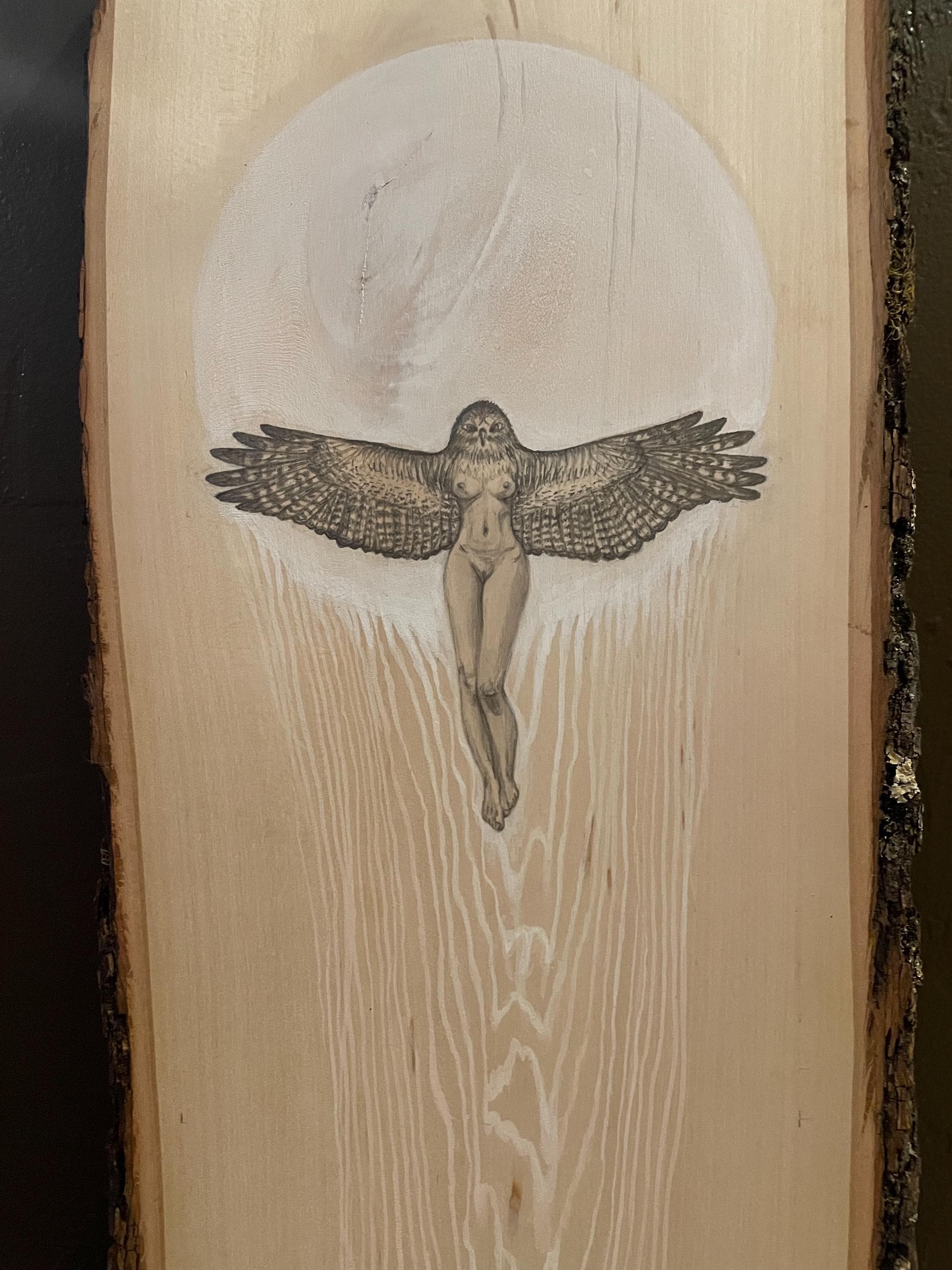 Original pencil and acrylic paint illustration on live edge, moss covered wood.