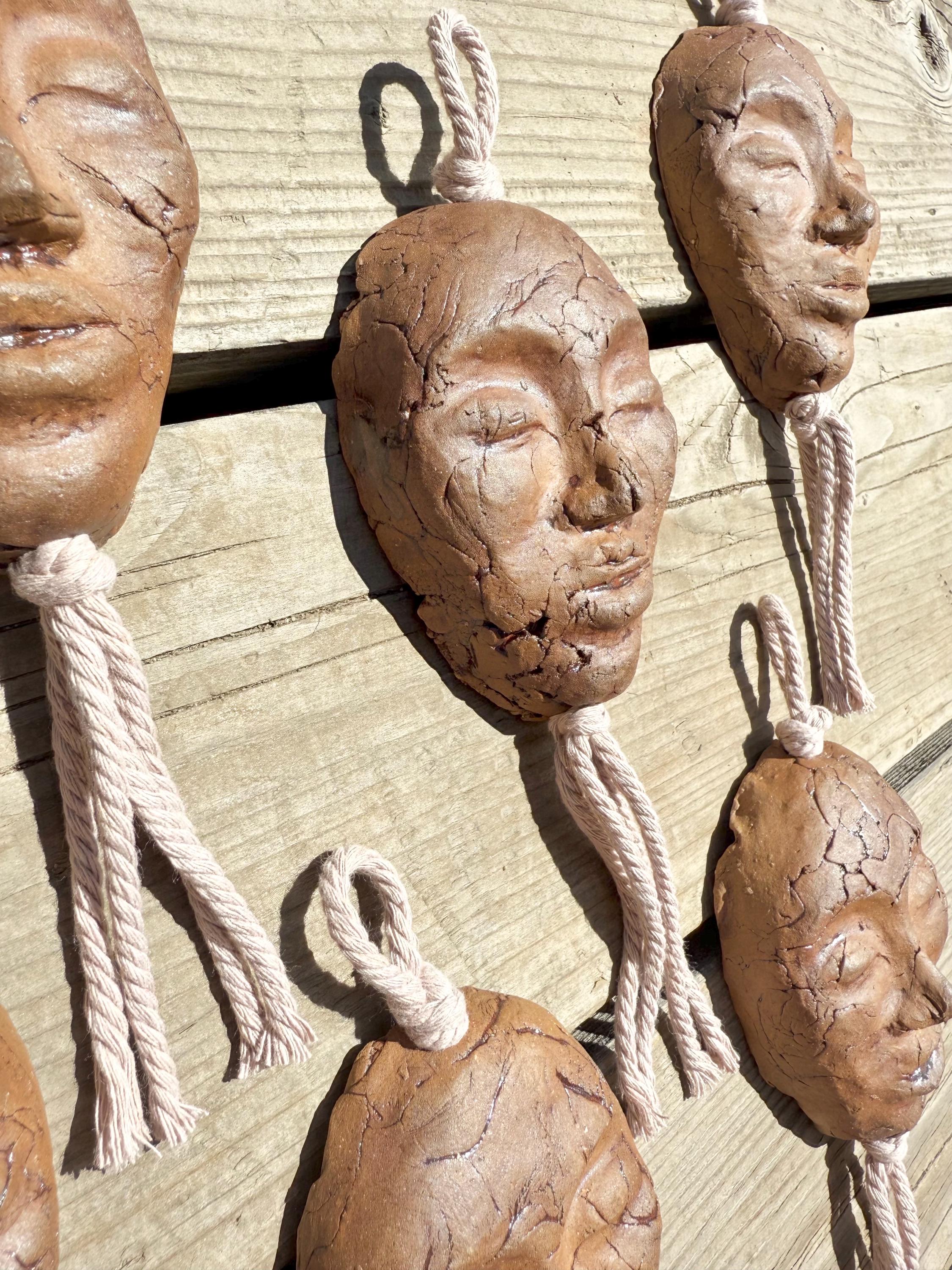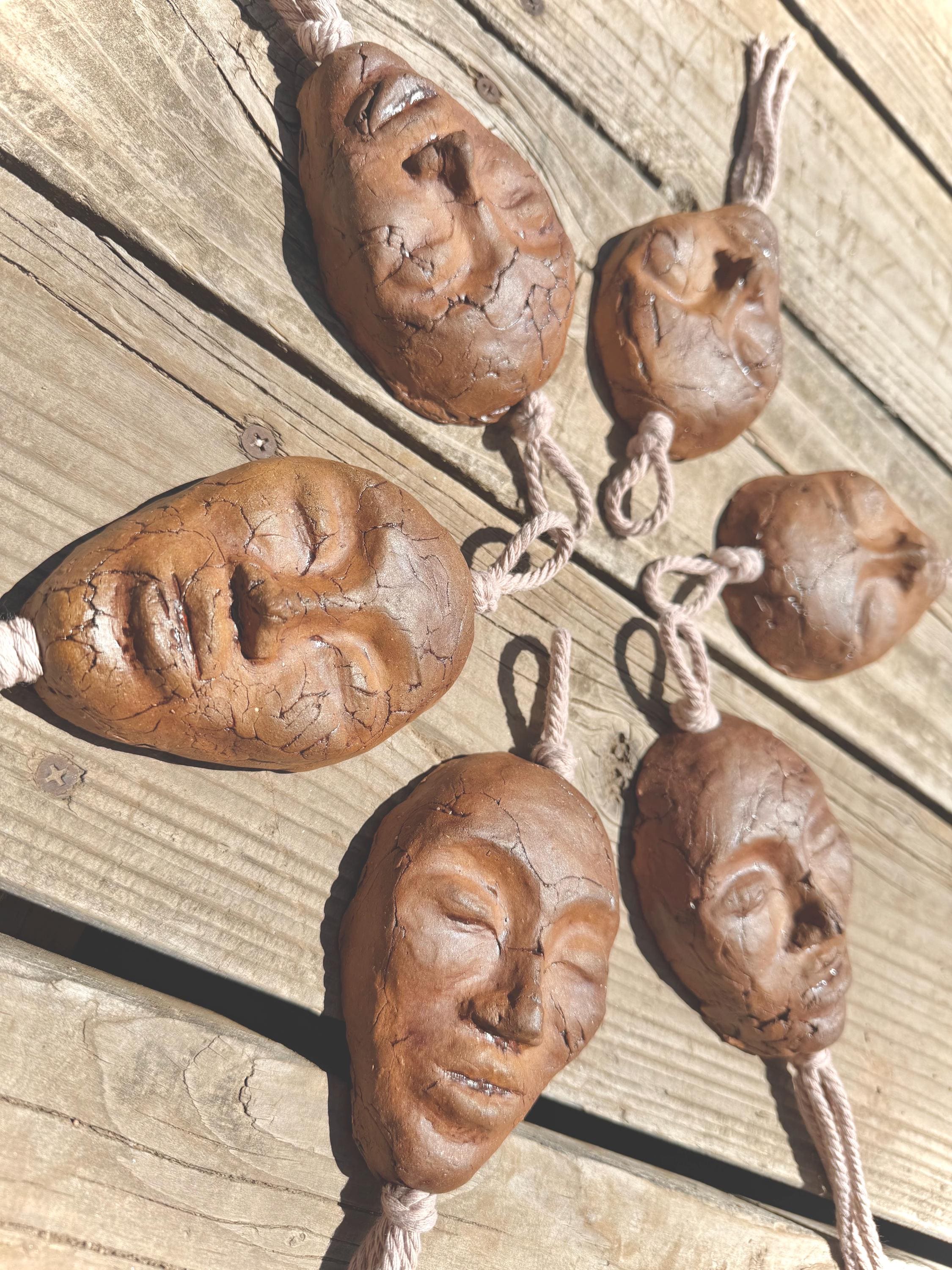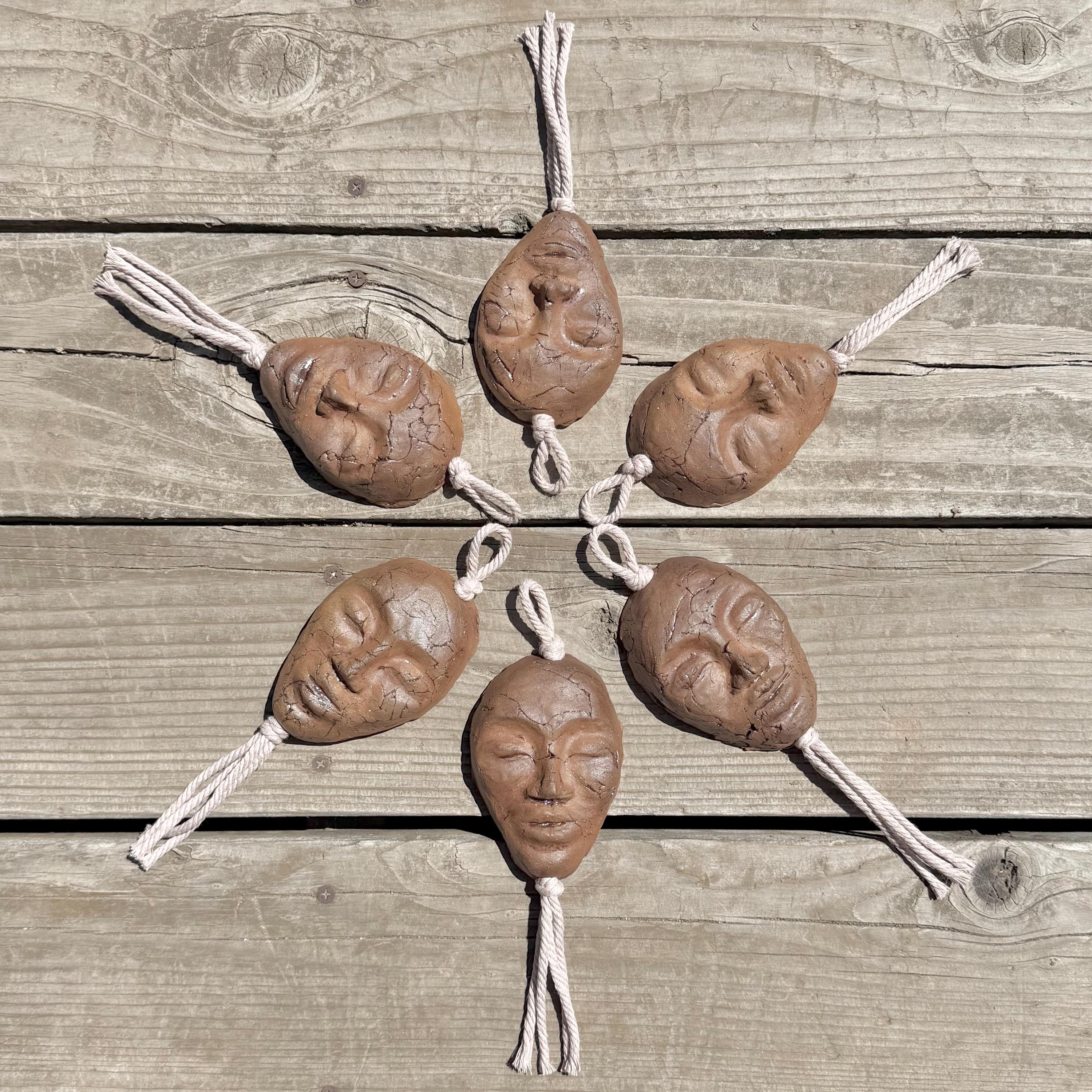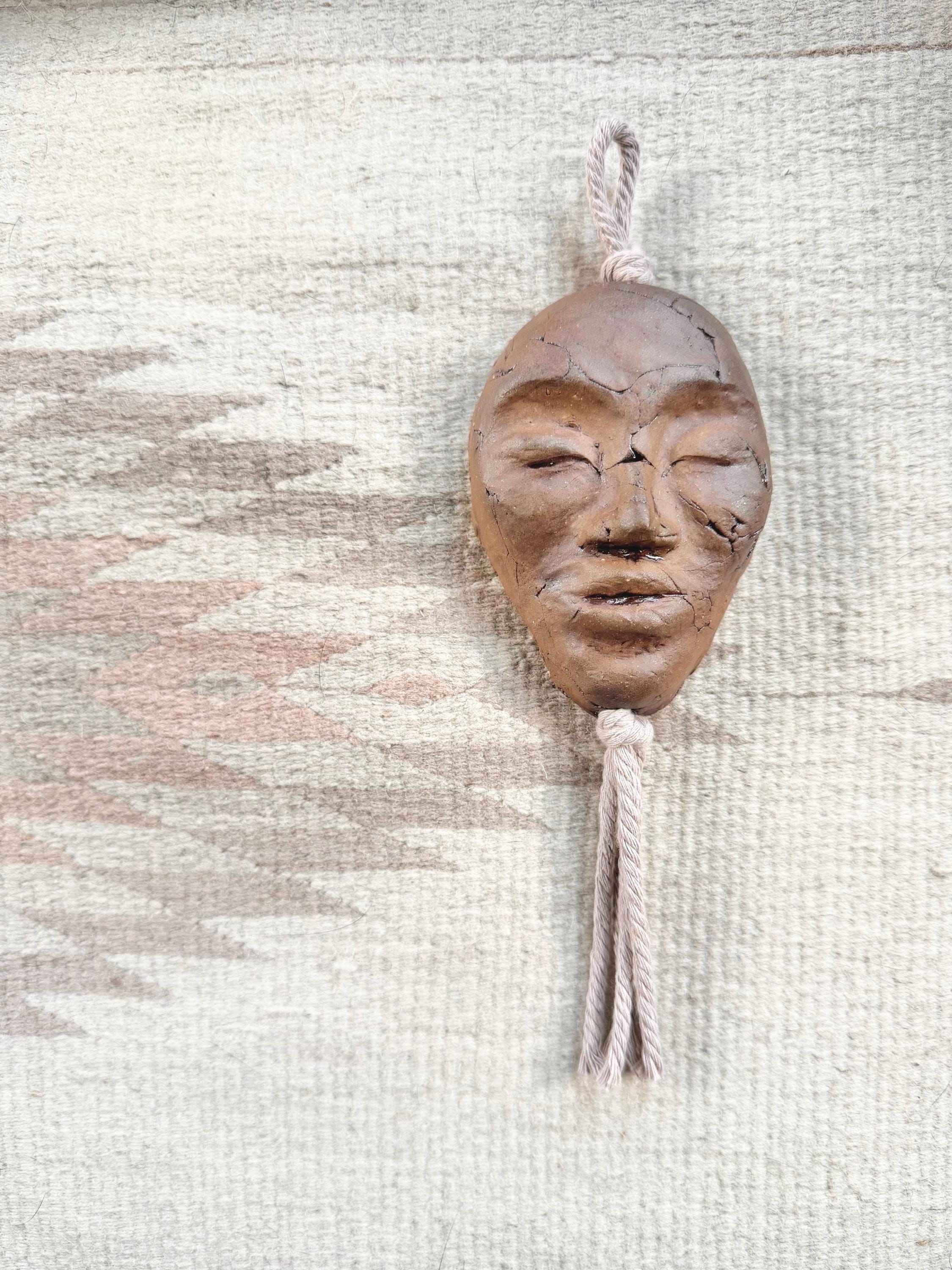 Dark Clay Goddess Face Wall Hanging with Lilac Macrame