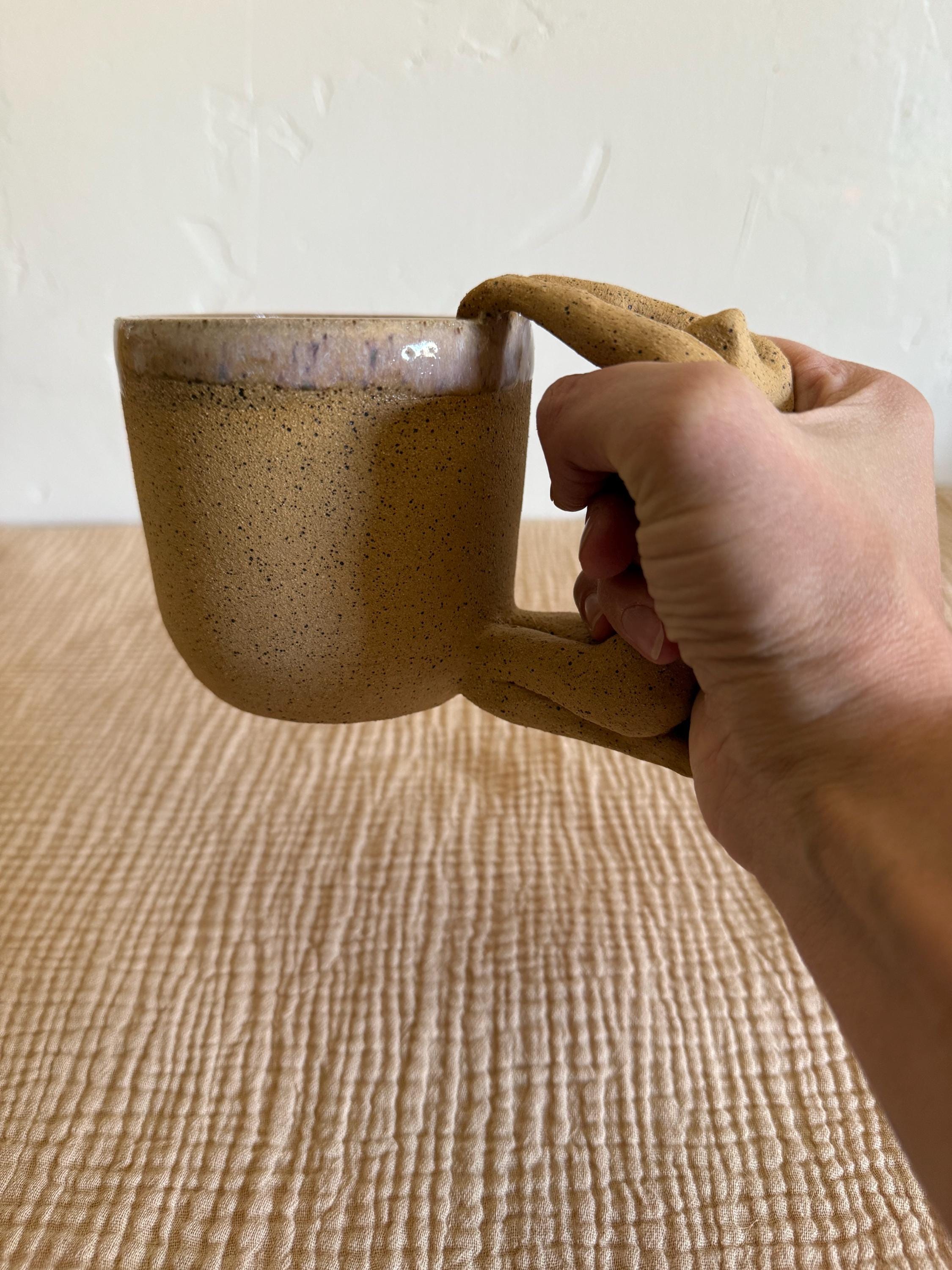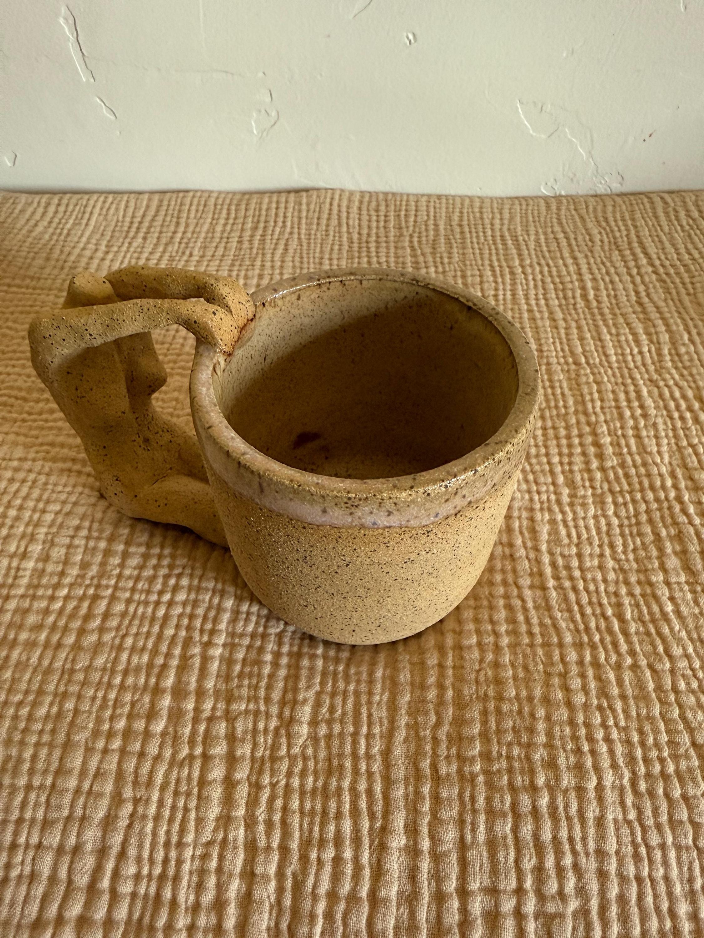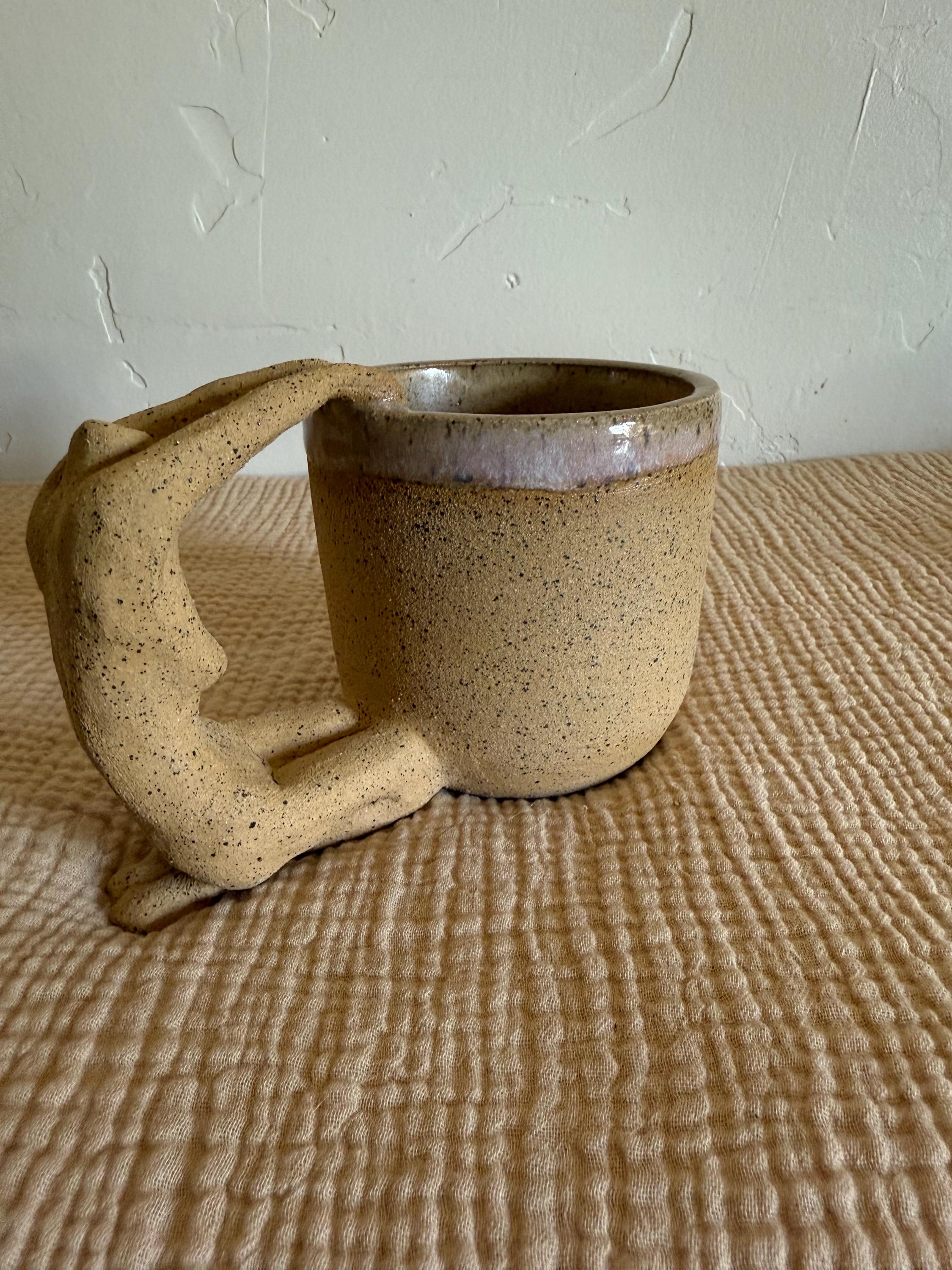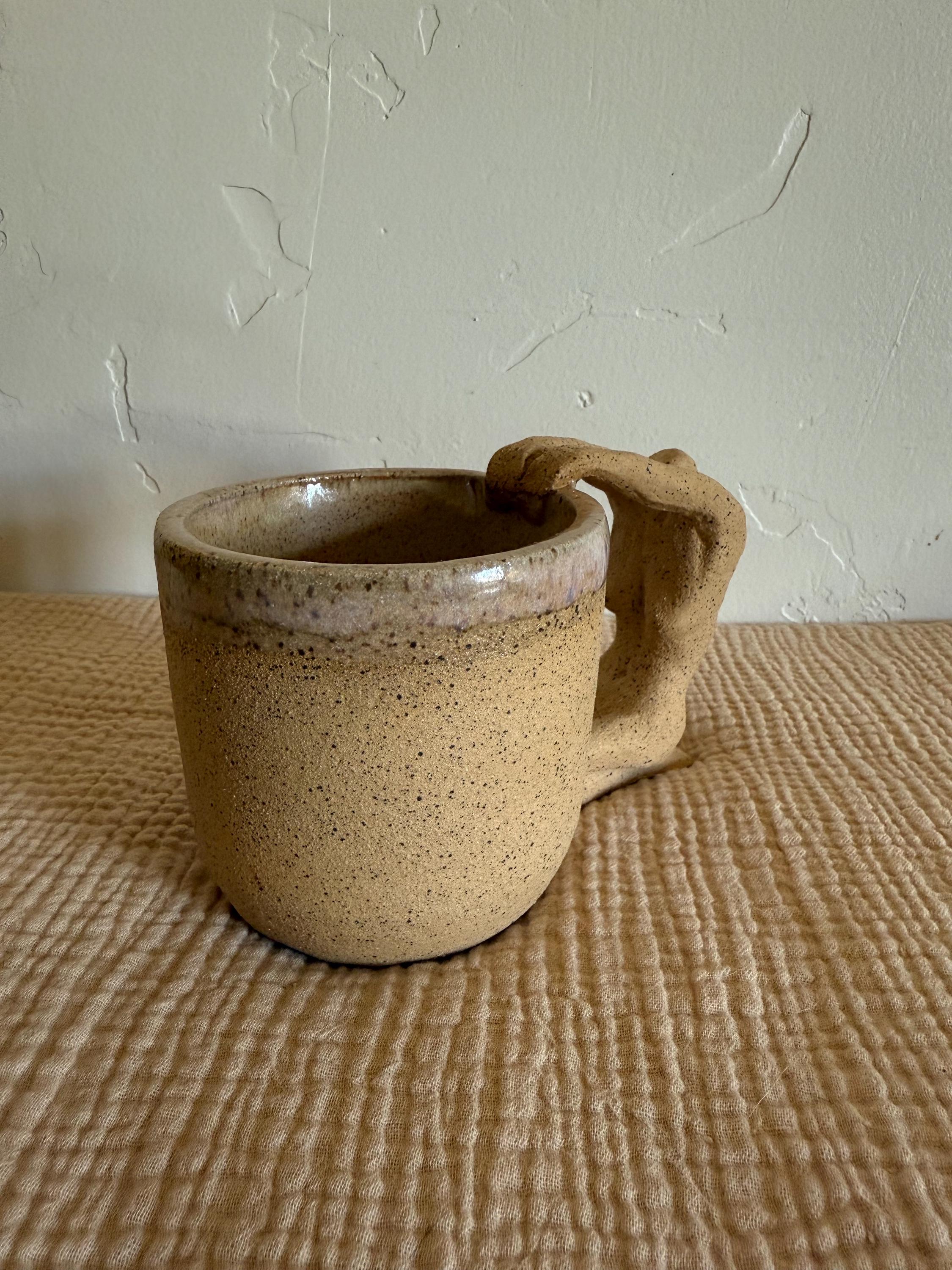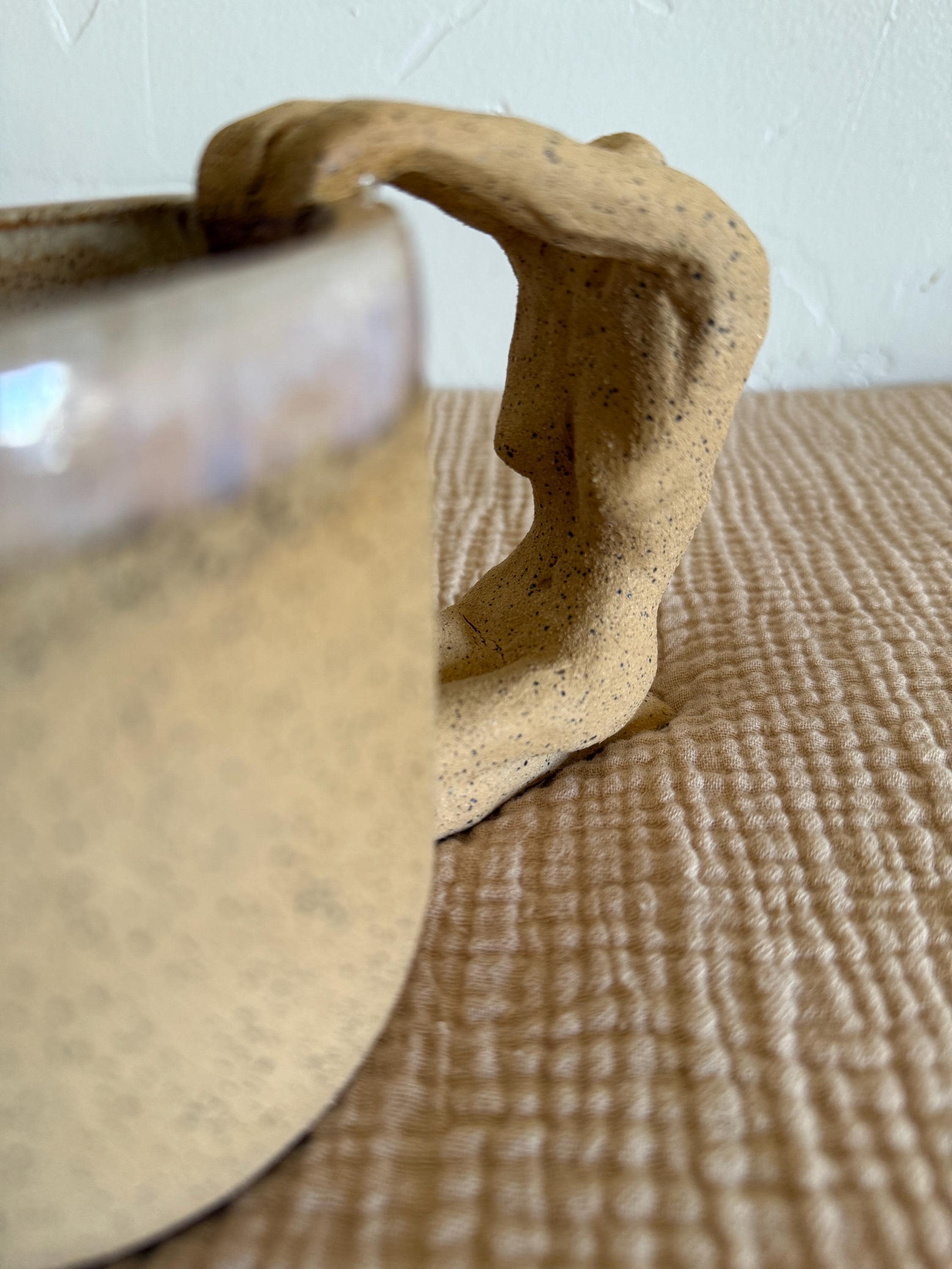 This hand thrown drinking vessel features a unique, hand sculpted, feminine form handle. The exterior has been left unglazed for a natural, raw feel.